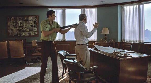 “Dead Man’s Wire” is Gus Van Sant’s latest film, which follows the 1977 true story of Tony Kiritsis, played by Bill Skarsgard, who kidnaps someone who has wronged Richard Hall, played by Dacre Montgomery. But it was really Hall’s father, played by Al Pacino, who screwed him. Having Pacino in the cast reminds one of “Dog Day Afternoon,” which has similar themes. The title of the film comes from the odd way Kiritsis attaches a gun with a wire to Richard Hall. Through the film, the tension grows, but it is depicted by the cool performance of Colman Domingo, who plays Fred Temple, a local disc jockey, whom Kiritsis calls. Matt Zoller Seitz observes, “There’s an economic and political framework for the characters’ decisions—a thing few films even think to provide—and Van Sant and company observe them with irony, wonder, and compassion.”